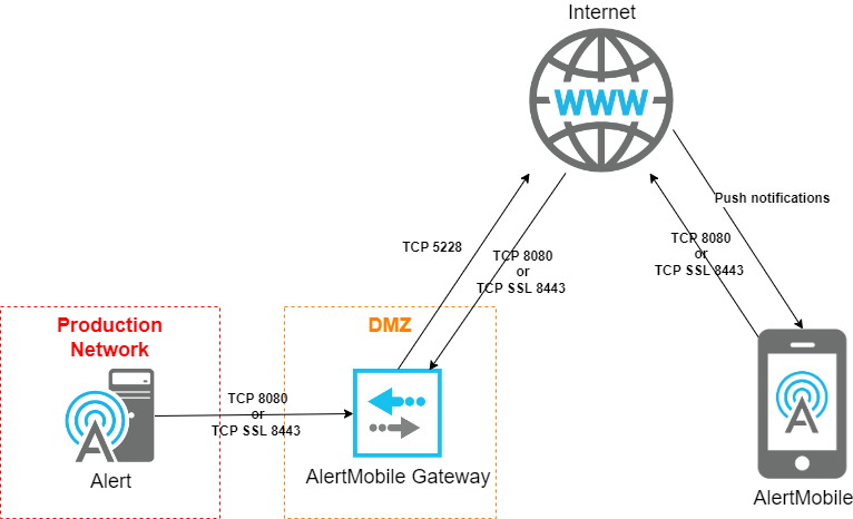 AlertMobile Gateway is an application that can be accessed from outside your infrastructure, so it must be configured alongside your IT department. As you see on the the illustration above, it can be installed on a different computer to the PC hosting the Alert service in a DMZ. In this case, the configuration settings will be defined to reflect your security strategy. |