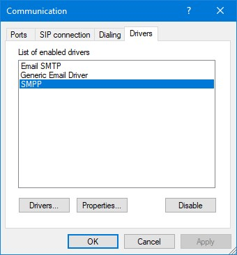 Underneath you will see the SMPP Driver in the Communication dialog box, the SMPP driver is now ready to use.