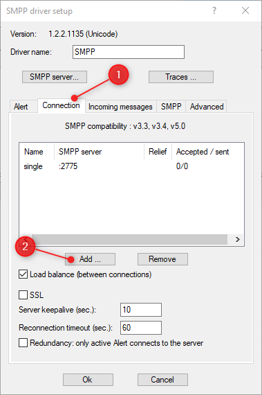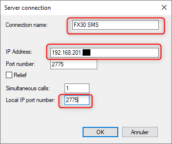 The only information to set will be entered in the SMPP driver "Connection" tab: enter the FX30 IP address and the IP port (2775 by default). See next screenshots.