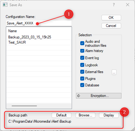 - To save the current configuration, write a name in the field Configuration Name (1) or select an existing name in the list (replacement of a saved configuration). If you configuration is for the technical support of Micromedia it is better to write in the name of the configuration the name of the site where Alert is installed and the date of the day.