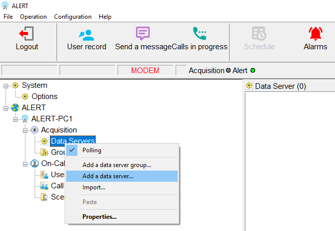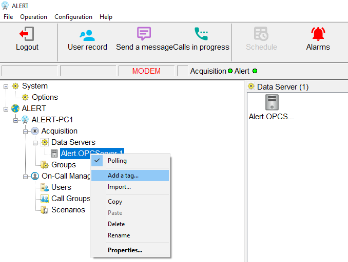 Right click on the data server "Alert.OPCServer.1" then "Add a tag..." :