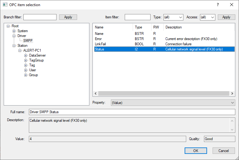 Select the variable "Status" located in Root -> Driver -> SMPP then click on "OK":