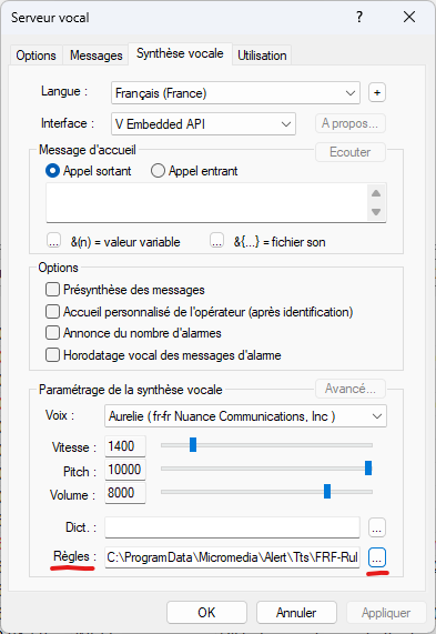 Il suffit ensuite de sauvegarder ce fichier. Puis pour que ALERT le prenne en compte, il faut ensuite le sélectionner pour la voix de synthèse configurée dans ALERT.