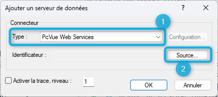 Puis dans la fenêtre Ajouter un serveur de données, vous devez sélectionner le type de connecteur PcVue Web Services (1) et cliquer sur le bouton Source... (2) pour spécifier les paramètres de connexion