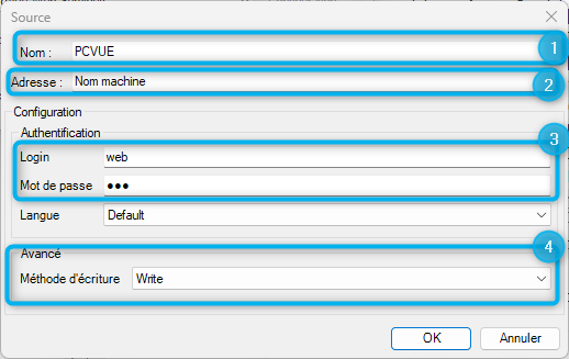 Nom (1) : Indiquer le nom de votre serveur de données. (Exemple : PCVUE)