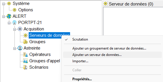 Dans Alert, si vous voulez ajouter une connexion à un serveur de données PCVUE Web Service, vous devez faire un clic droit sur Serveurs de données dans l'arbre :