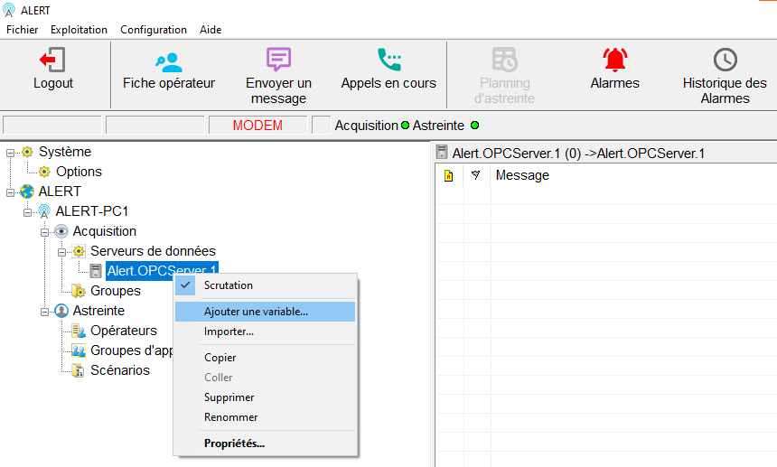 Faire un clique droit sur le serveur de données "Alert.OPCServer.1" puis "Ajouter une variable..." :