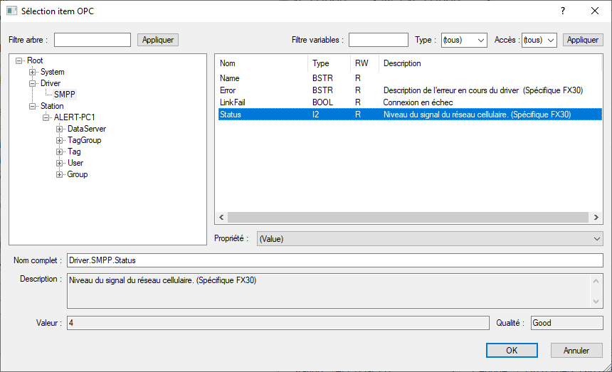 Sélectionner la variable "Status" se trouvant dans Root -> Driver -> SMPP puis cliquer sur "OK":