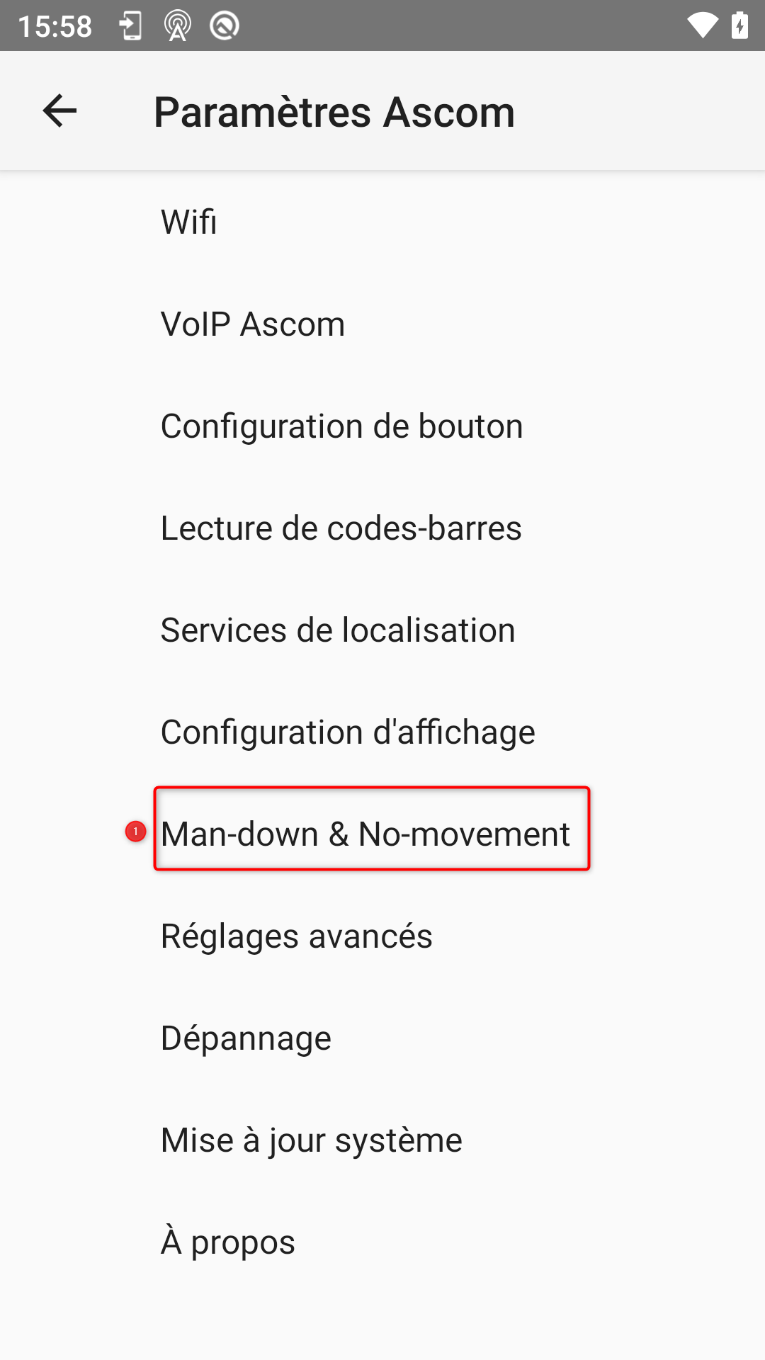 Dans les "Paramètres Ascom", il faut aller dans "Man-Down & No-movement":